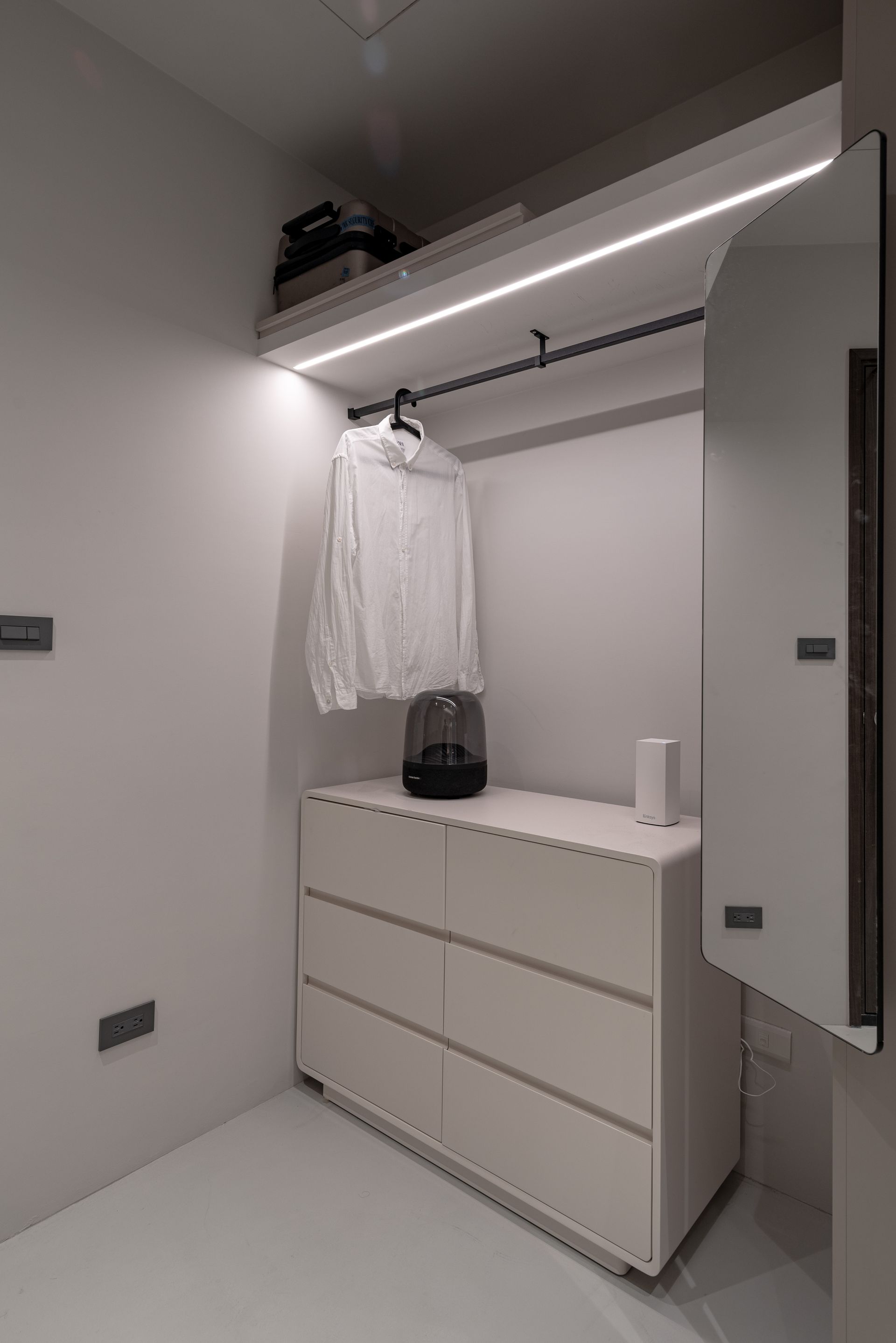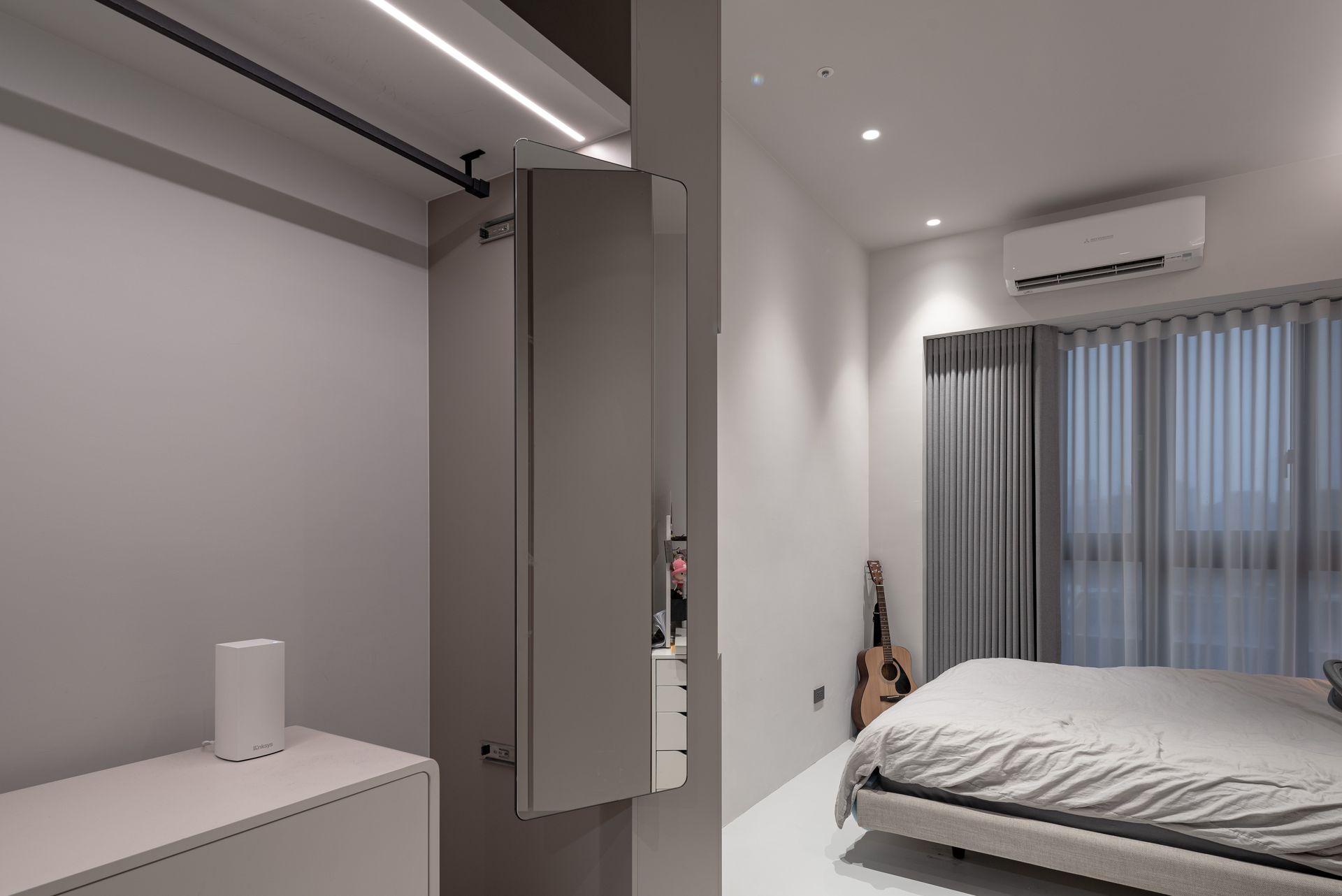 原有大樑的立面,透過電視牆牆面上段與旁側隔間牆面不同深淺產生的幾何切割,
